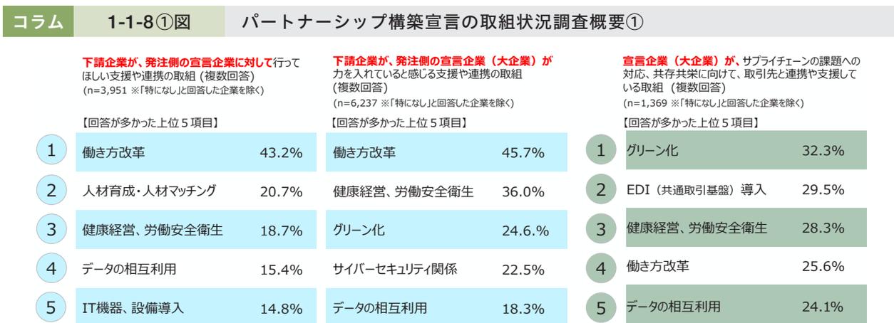 コラム1-1-8①図は、「受注側企業が、発注側の宣言企業に対して行ってほしい支援や連携の取組」、「受注側企業が、発注側の宣言企業(大企業)が力を入れていると感じる支援や連携の取組」、「宣言企業(大企業)が、サプライチェーンの課題への対応、共存共栄に向けて、取引先と連携や支援している取組」について、それぞれ上位5項目を示したものである。受注側企業が発注側である宣言企業に期待する取組、受注側企業が発注側である宣言企業が力を入れていると感じる取組のいずれにおいても「働き方改革」の取組支援が最も多く挙げられた。